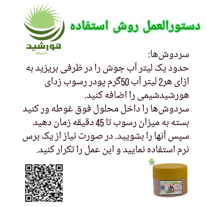 حدود یک لیتر آب جوش را در ظرفی بریزید به ازای هر2 لیتر آب 50 گرم پودر رسوب زدای هورشیدشیمی را اضافه کنید.