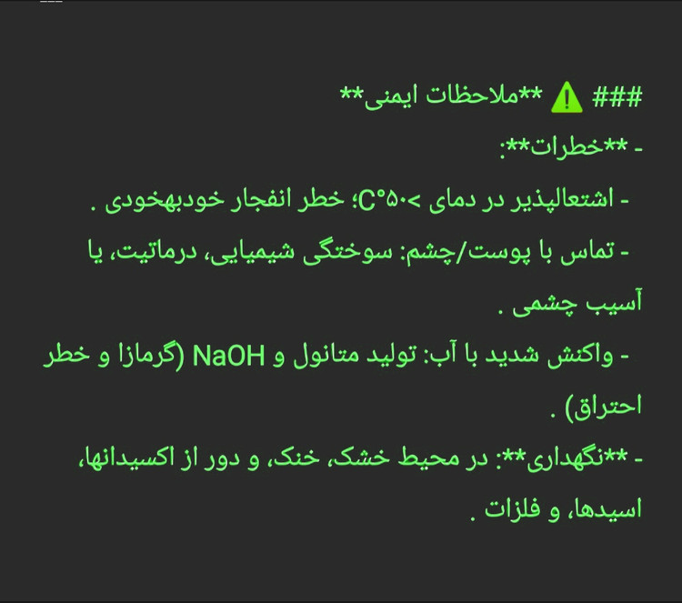 - **نگهداری**: در محیط خشک، خنک، و دور از اکسیدانها، اسیدها، و فلزات .